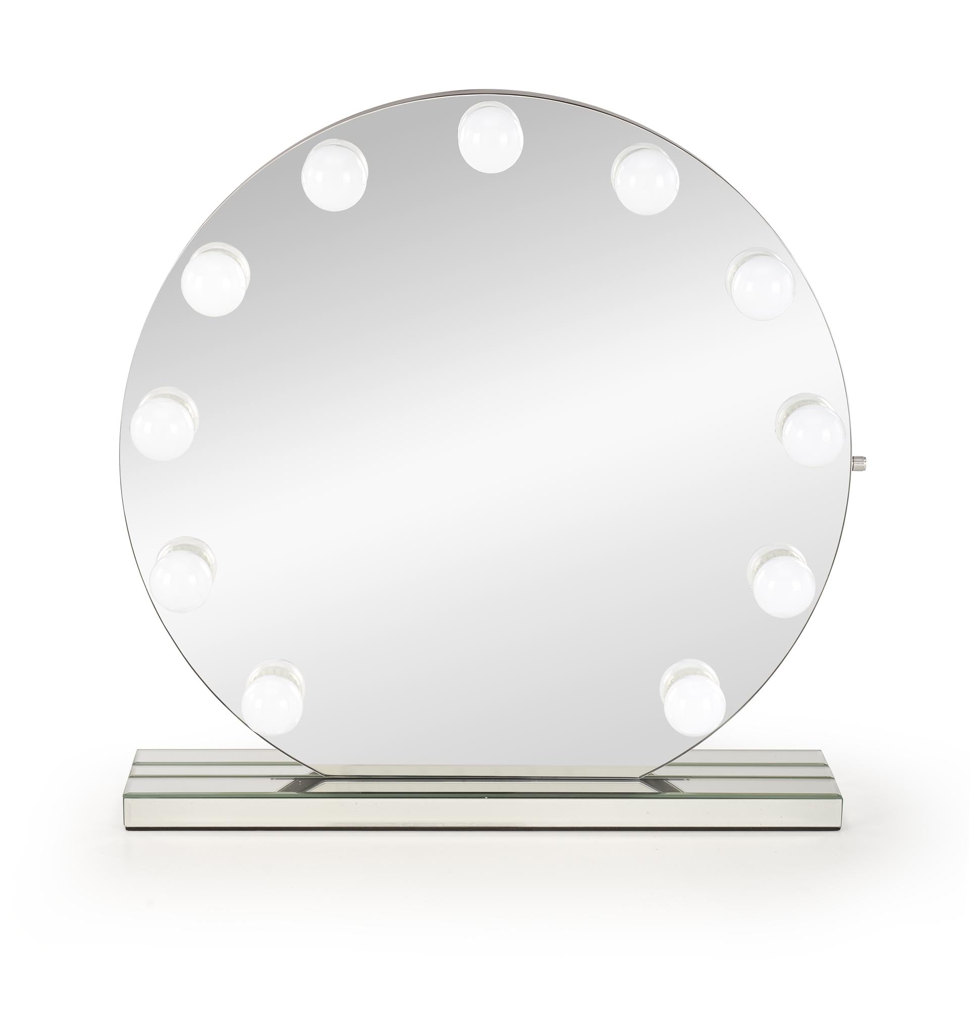 - Materials: mirror (glass), leg/base MDF board, LED lighting