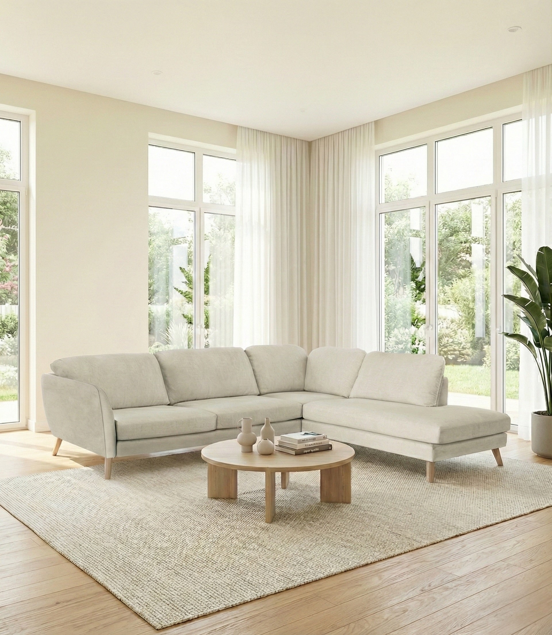 Linnea avokulmasohva henkii skandinaavista estetiikkaa, jossa yhdistyvät yksinkertaiset linjat ja rauhalliset värit.