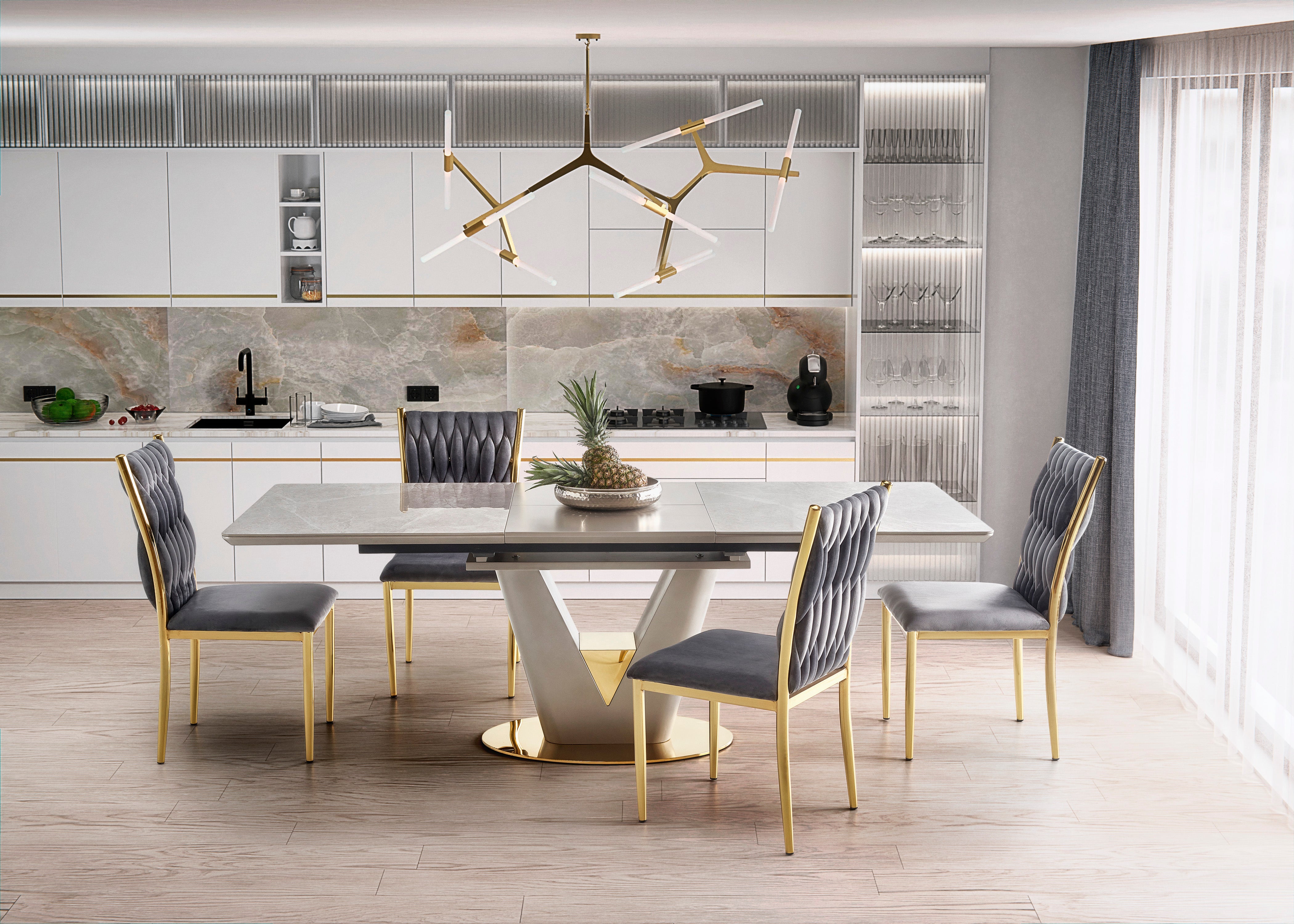 Valentin jatkettava ruokapöytä on erinomainen valinta, joka tuo elegantin ilmeen ruokailutilaasi. Sen keraaminen kansi ja joustava mitoitus tekevät siitä täydellisen ratkaisun niin arjen aterioille kuin juhlallisiin tilaisuuksiinkin. Sen hienostunut ilme, harmaa marmori/vaaleanharmaa/kulta-väriyhdistelmä, luo modernin ja ylellisen tunnelman, joka houkuttelee niin perhettä kuin vieraitakin.
